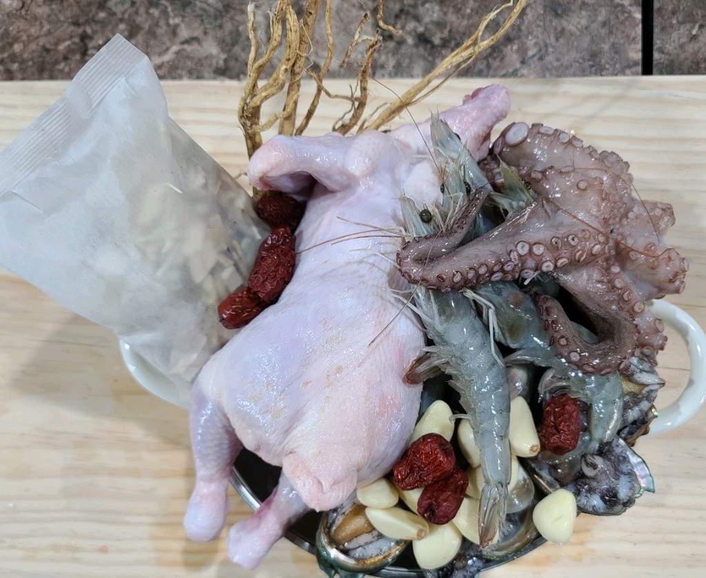 ◾알차고 좋은 구성으로 기획했습니다!!◾들어있을건 다든 알찬 구성!!◾다른재료 다익히고 닭배가 하늘을 보게해서 차가운 기운만 가시게 해서 드시면 제일 맛있게 드실수 있어요!!육.해.공이 모두 들어간 보양식 끝판왕!!어묵을 넣어 더 푸짐하게 즐기거나마지막에 누룽지나 칼국수를 넣어국물까지 남김없이 드셔보세요~~